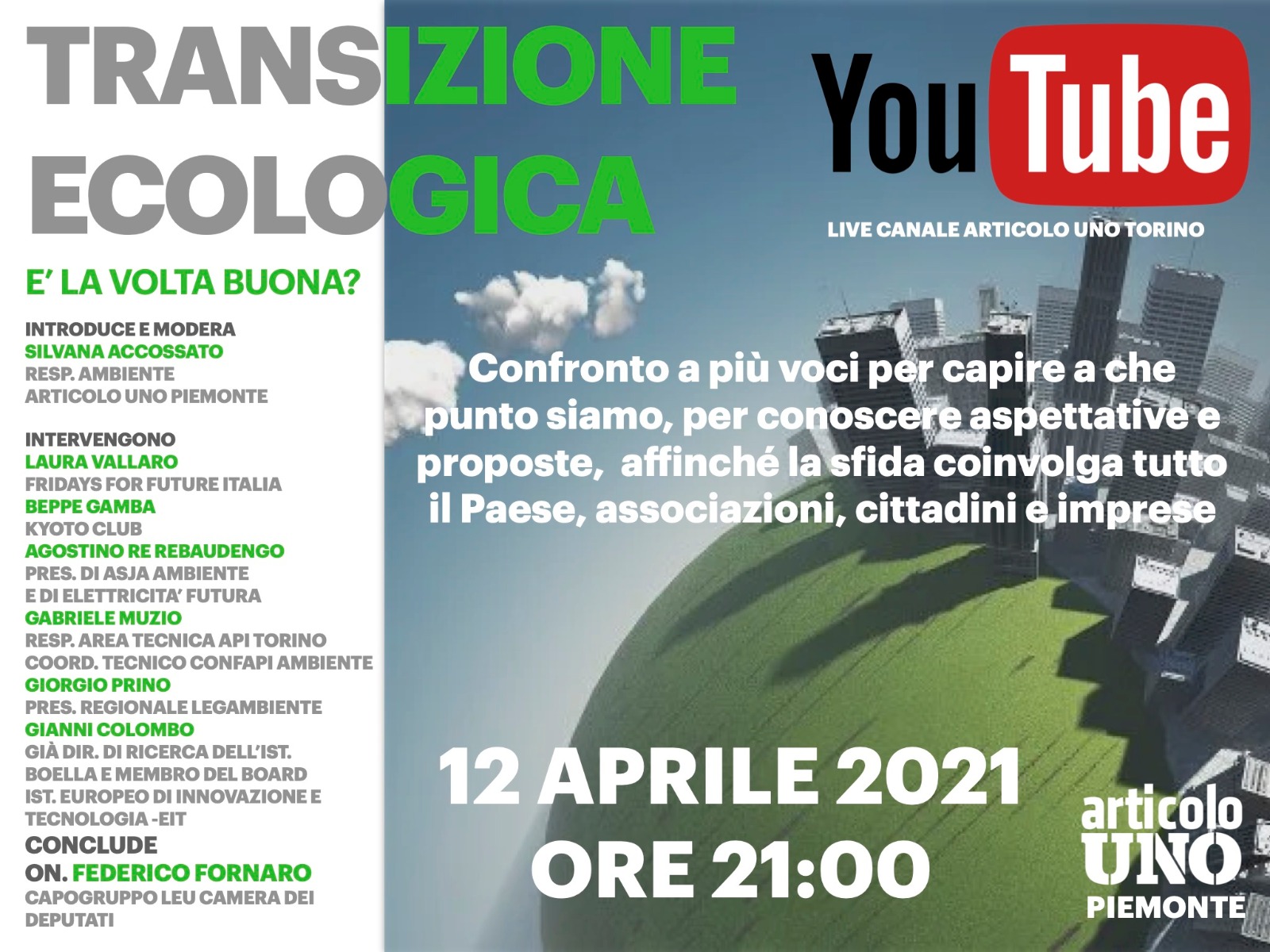 Articolo Uno Torino organizza sul suo canale Youtube un live meeting dal titolo "Transizione ecologica è la volta buona?", in programma il prossimo 12 aprile alle ore 21:00. Per Elettricità Futura interverrà il Presidente Agostino Re Rebaudengo, per un confronto insieme ad altri rappresentanti del settore con l'obiettivo di fare il punto sulla transizione ecologica, sulle aspettative e le proposte in merito, affinchè la sfida coinvolga tutto il Paese, le associazioni, i cittadini e le imprese.