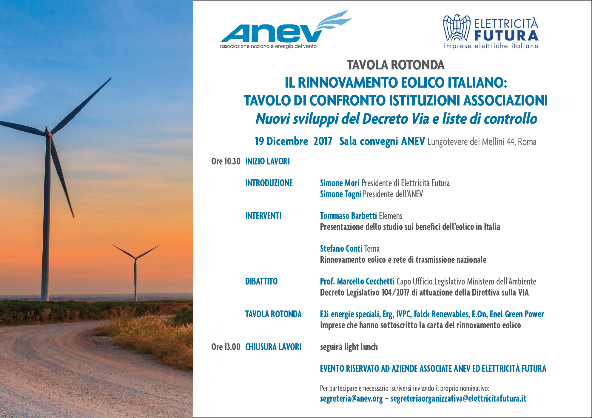 Dopo l'introduzione di Simone Mori, Presidente Elettricità Futura e Simone Togni, Presidente ANEV, la tavola rotonda vedrà gli interventi di Tommaso Barbetti di Elemens e Stefano Conti di Terna. La seconda parte della mattinata procederà con un dibattito sul Decreto Legislativo 104/2017 di attuazione della direttiva sulla VIA tenuto dal prof. Marcello Cecchetti (Capo Ufficio Legislativo Ministero dell'Ambiente) e una tavola rotonda a cui prenderanno parte le imprese che hanno sottoscritto la carta del rinnovamento eolico.