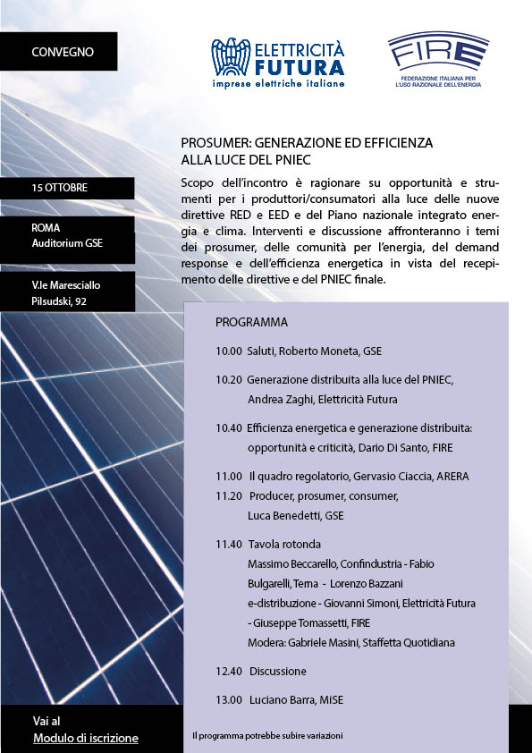 Il convegno "Prosumer: generazione ed efficienza alla luce del PNIEC" organizzato da Elettricità Futura e FIRE si svolgerà il 15 ottobre 2019 presso l'Auditorium del GSE (V.le Maresciallo Pilsudski, 92) dalle ore 10:00 - 13:00.