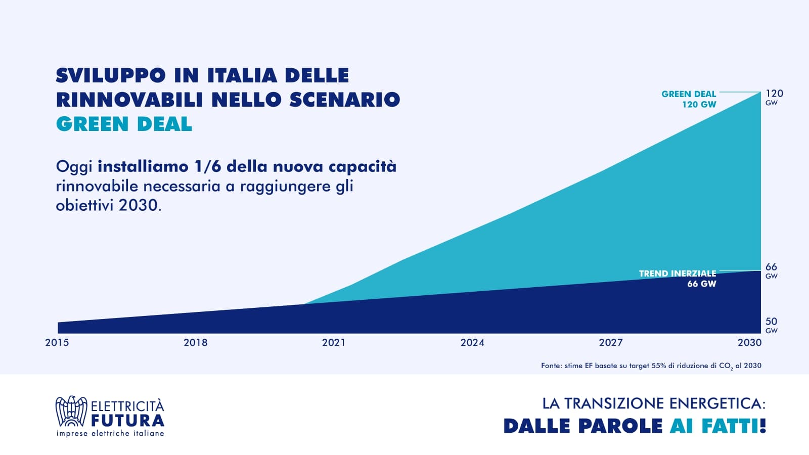 Per raggiungere il target del Green Deal 2030 è necessario realizzare in Italia almeno 65 GW di nuova potenza da fonti rinnovabili entro il 2030. In questo contesto ambizioso, acquistano significato le iniziative finalizzate a dare nuovo impulso agli investimenti per l’ulteriore sviluppo delle fonti rinnovabili. L’Italia dovrà mettere in campo azioni e politiche per favorire gli investimenti nelle rinnovabili, definendo regole chiare e armonizzate per realizzare impianti che producano più energia verde e a prezzi competitivi.