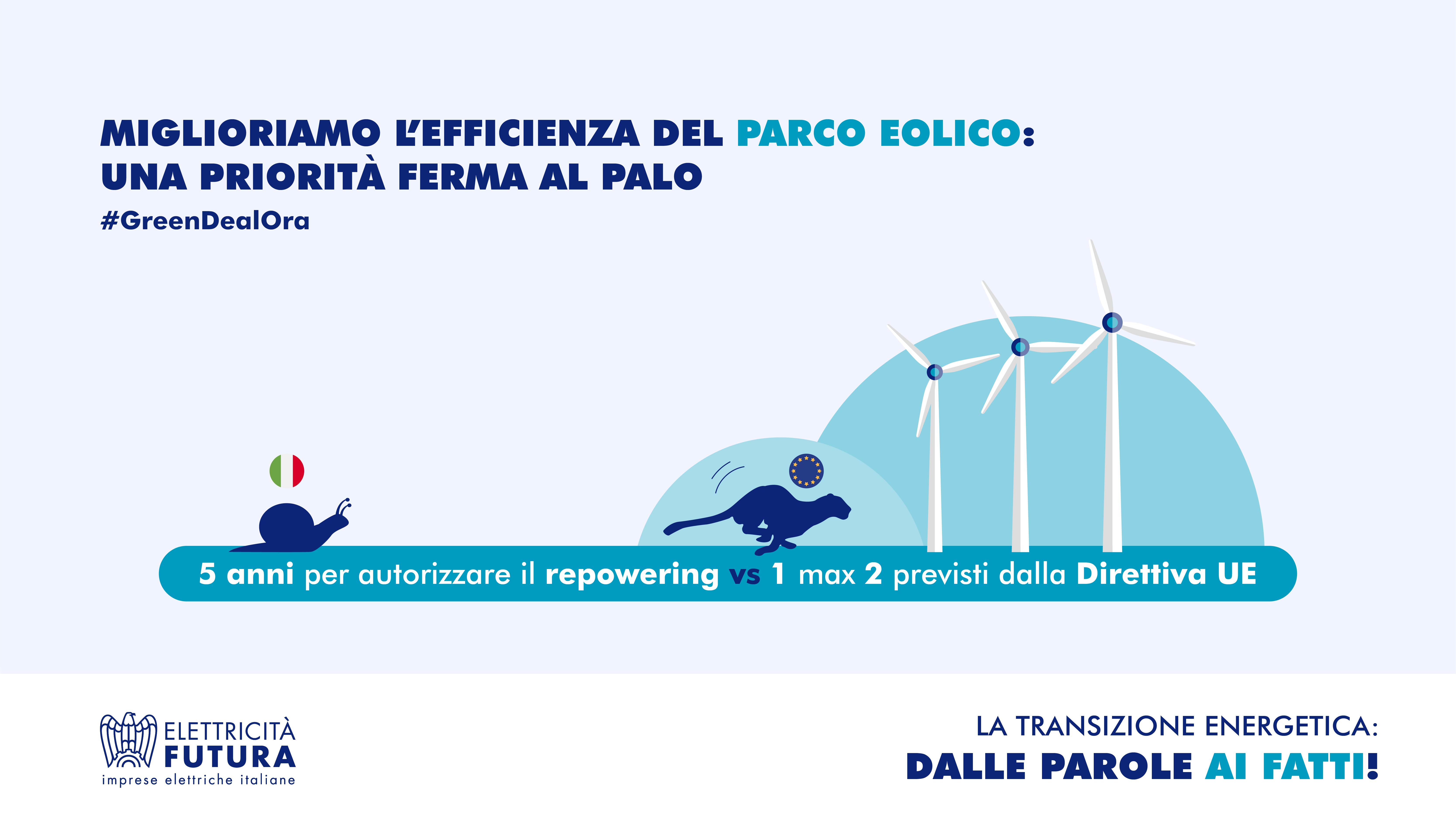 E’ necessario migliorare l’efficienza dei parchi eolici grazie al repowering lavorando sulla semplificazione normativa. La durata delle procedure autorizzative per l’eolico (quindi anche per il repowering) è nel nostro Paese pari a 5 anni, di gran lunga superiore a quella stabilita dalla Direttiva RED II di un anno, massimo due per casi eccezionali. Infatti, durante iter tanto lunghi, cambiano le tecnologie di riferimento, le condizioni al contorno (incluso lo sviluppo della rete e il contesto normativo regolatorio) e i progetti da autorizzare rischiano di arrivare al permitting già vecchi!