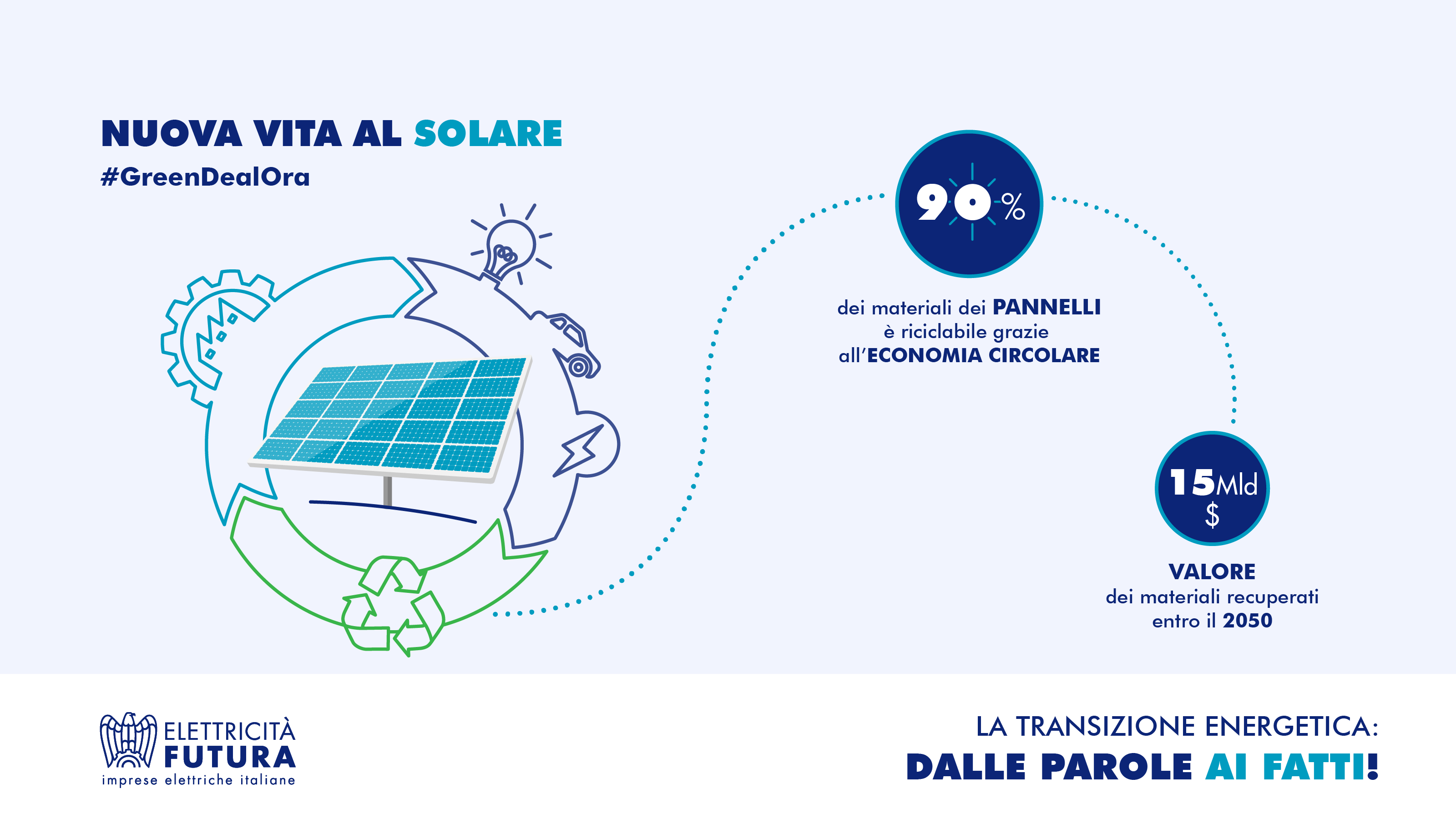 Quello elettrico è di fatto uno dei settori più legati all’economia circolare, dall’efficienza energetica allo smaltimento dei rifiuti. Con le tecnologie attuali si arriva tecnicamente a poter riciclare il 90% dei materiali dei pannelli fotovoltaici. La prospettiva tecnologica ci suggerisce un incremento di questa percentuale, grazie anche all'utilizzo di materiali innovativi, e di conseguenza anche dei benefici legati.
