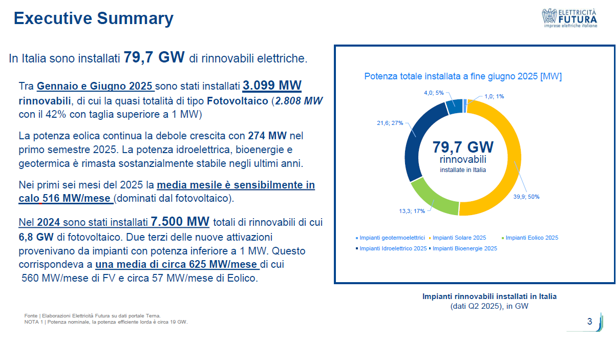 Il Report, elaborato da Elettricità Futura, è stato arricchito con dati e trend a livello europeo, con focus su solare ed eolico e approfondimenti dedicati a Germania e Spagna. I dati, aggiornati alla prima metà del 2025, includono inoltre previsioni di medio termine per l’eolico elaborate dalle principali Associazioni europee a cui Elettricità Futura aderisce.
