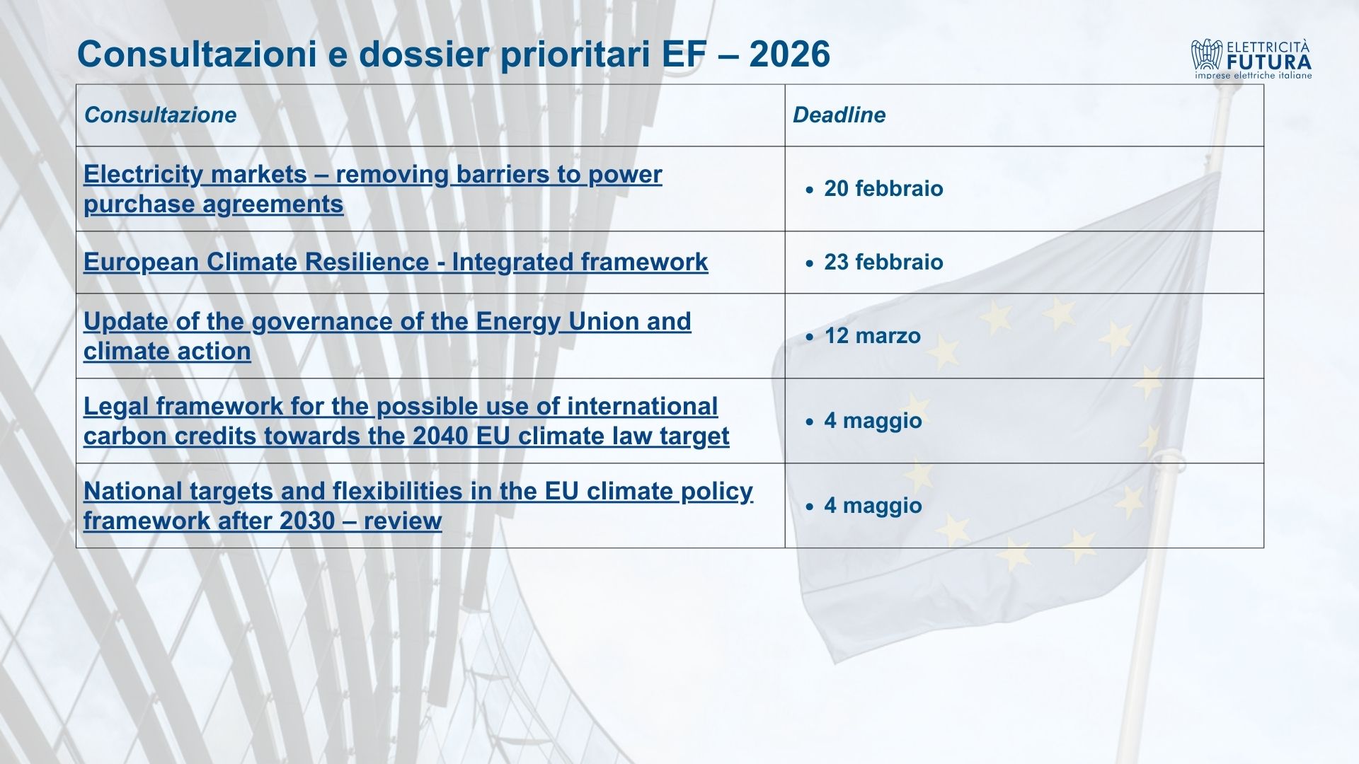 Elettricità Futura partecipa alle consultazioni pubbliche dell’Unione Europea ed elabora contributi tecnici sui principali dossier legislativi e regolatori in materia energetica comunitaria.